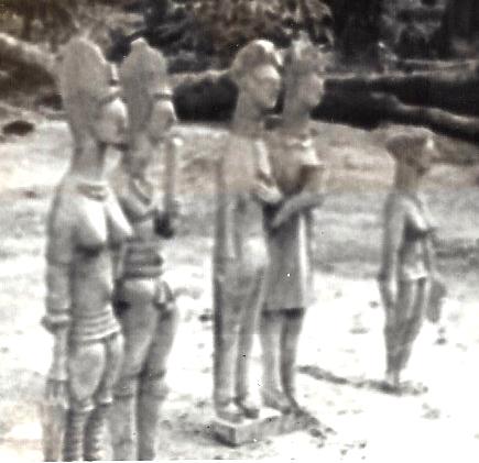 I took the following notes, but now (50+ years later), I realize that I did not record the village name, perhaps to protect it from becoming a target of the shrine burners. Unfortunately, the information I was able to collect hastily from the workmen was limited. First, they were startled when a white man stopped his car to show interest. Second, they were very uneasy when I got out my camera. A few greetings in my imperfect Igbo language and some praise for the figures relaxed them a bit, but the sun was going down, and I was still more than an hour from Enugu. So, my time and their patience were limited.