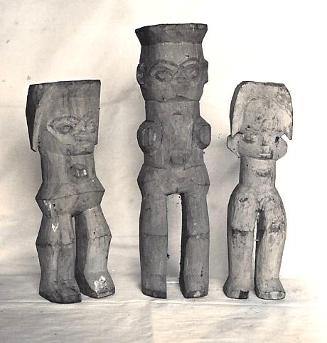 They told me the tall male figure (far left) is named "Ezealaogaku", or alternately "Ezealaogugo". They told me (quote), "These two (including the wife next to him) have got sons and daughters (gods and goddesses) who have become gods and goddesses of smaller areas." They said the shorter male figure (third from the left, third tallest) is "the prince, who will take the place of the Ezealaogaku", and therefore "his leg must not touch the ground until he takes over (?!)". "He sometimes demands things that his father does not like to give him, like having a beautiful girl sacrificed to him. This young one can cause much trouble by sending out the father's counselors to do his deeds. He can dry up the Mba River for two to three weeks until the priest can discover what is wrong."