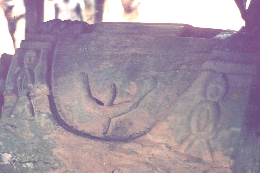 I ducked under the low palm frond roof and marveled at the relief carvings on the giant gong. Of course, I couldn't resist, and not knowing any better, I softly tapped the sounding panels with the end of my finger. Their tone was clean and clear. So impressive. This thing was decades old in the African weather (rain, heat, humidity) and still had tonal integrity. (Later, the carver, Aka Gworotold, told me he was the person who carved it! He said Ngele Ebelebe is the name of the god for whom it is carved.)