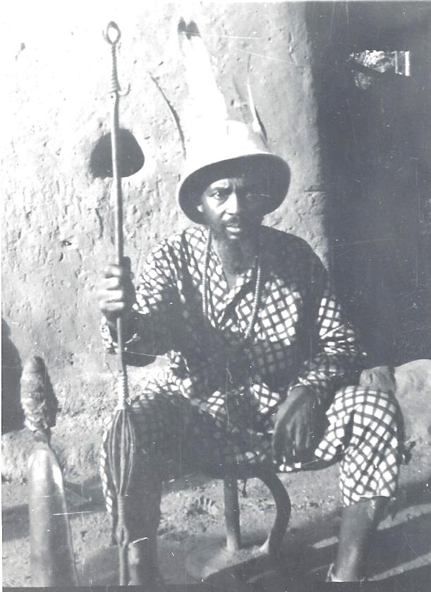 A few weeks later, I returned to Inyi to pay respects to Ama Dike and give him a little more money on the transaction. That day, we were able to meet the shrine priest (the man whom I had met so unexpectedly at the ikoro sounding). We convinced him to bring out some of the shrine pieces for a photograph. He proudly presented himself for a portrait with his staff of authority, metal-sounding gong, and hat with feathers while sitting on his ceremonial stool.