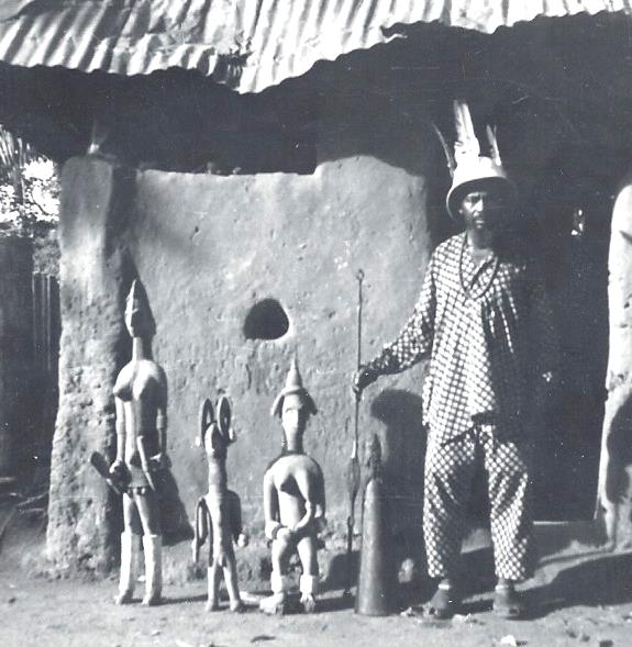 Later that day, I found my elementary school teacher friend at the market. He spoke good English, was a citizen of the village, and had sound status there. I used him as my translator. We went to the compound of the oldest carver there, named Ama Dike, an elderly and somewhat small-sized man and an immensely talented carver who learned his design craft from earlier generations. We had met many times before, and he sold me several wonderful (newly carved) masks. I told him I had been to the shrine and how beautiful the figures were. He seemed to appreciate that and replied that he had carved most of them years ago. I told him I saw a tall female statue, about "this high," which was holding a paddle with ivory bracelets on her long legs. He broke in to say proudly, "I carved that many years ago." The weather was mild and pleasant. We were comfortable and pleased to see one another.