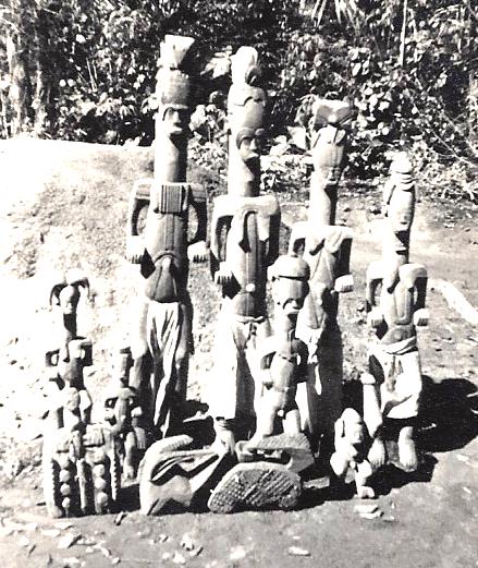 Most of the Igbo settlements are east of the mighty Niger River, but not all. There are also a handful of Igbo villages on the western side. The biggest is Asaba, featuring the ferry dock directly opposite the huge and bustling Onitsha. I traveled through this western Igbo territory every time I went to Benin City, which lay on the far side of the Igbo, but I never had the time or inclination to dig into their traditional arts like I did on the eastern side of the Niger. I did once, however, stop in Kwale and take these poor-quality pictures inside a shrine. One can make out some shorter statues there, but the remarkable stacked carving, displaying several individual figures, is prominent. I never saw such a stacked shrine piece on the eastern side of the Niger.