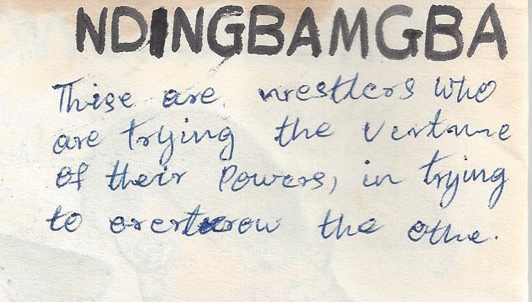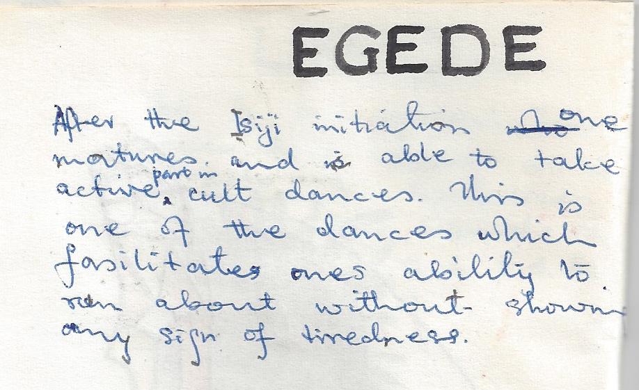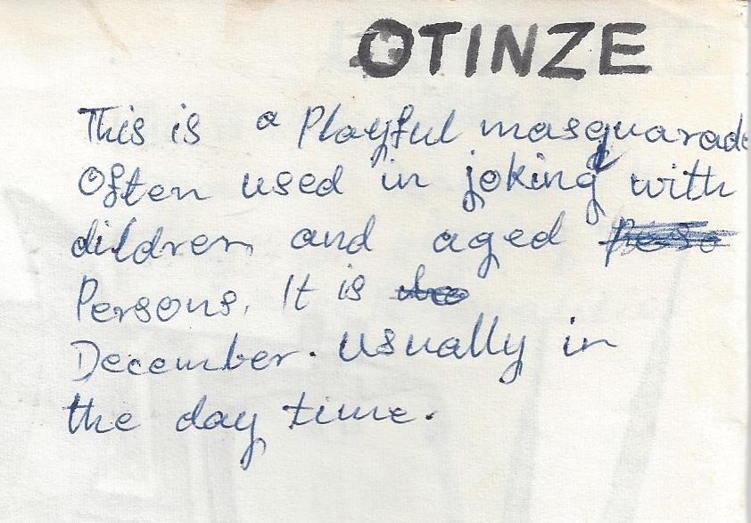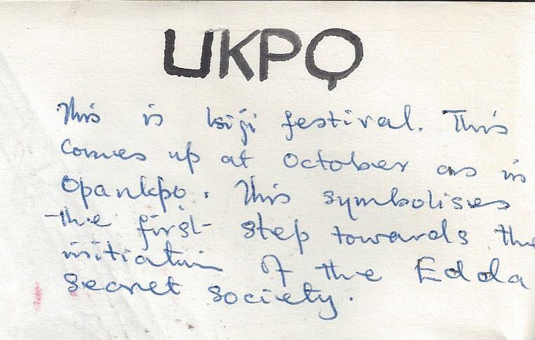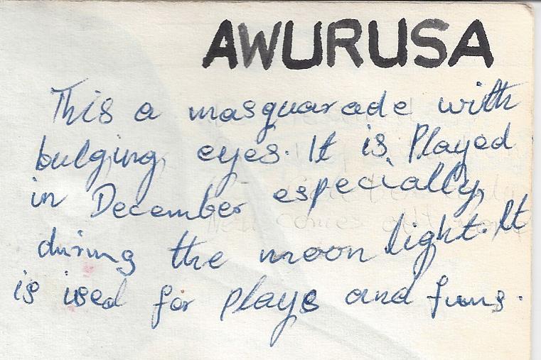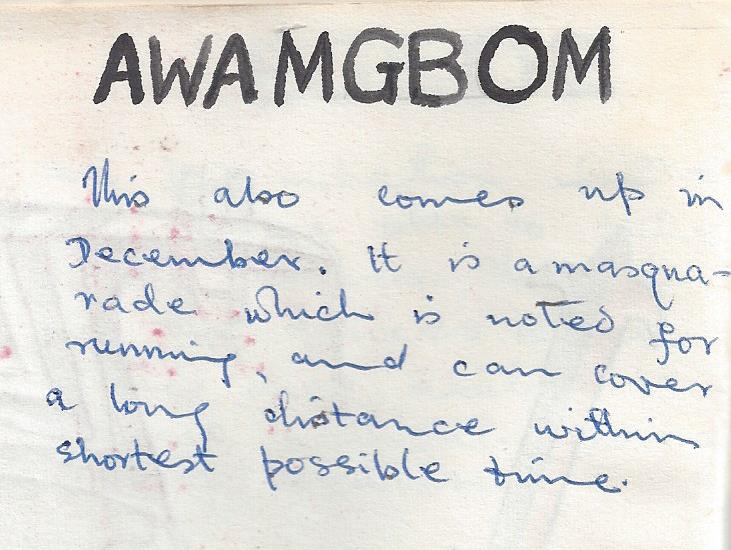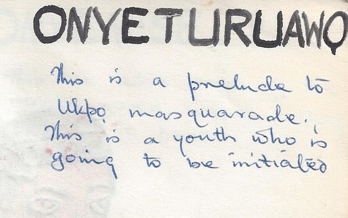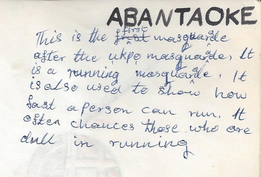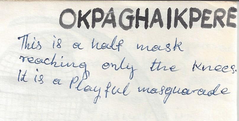 If I wasn’t around to see masquerades and couldn’t take pictures of them anyway, an idea and opportunity suddenly presented itself. Why not hire this teenager to produce watercolor paintings of so many of these masquerades? Fidelis acknowledged that he had detailed knowledge of the masquerades in his home village of Edda, just outside Afikpo town. I had collected a few Edda masks earlier and they can be found in the Gallery. Here was an opportunity to see what the accompanying costumes looked like, and to document the appropriate celebration or festival as well.