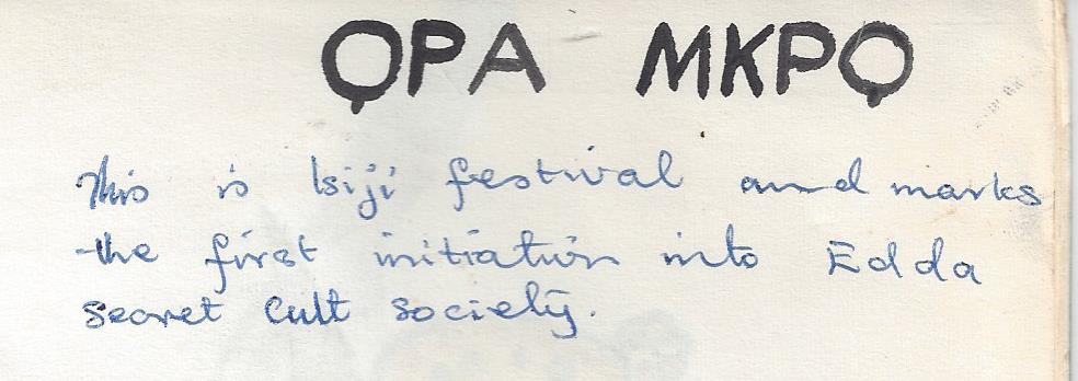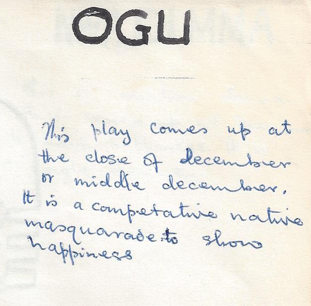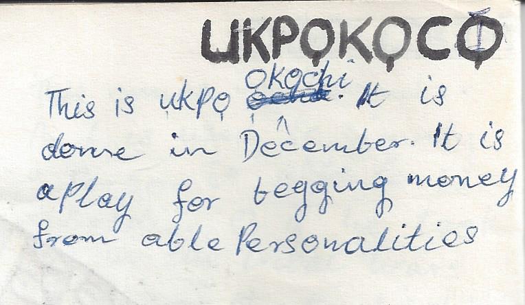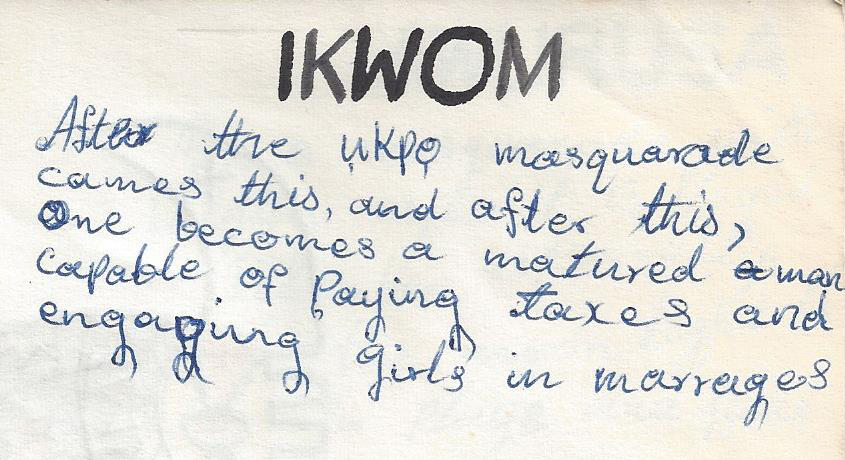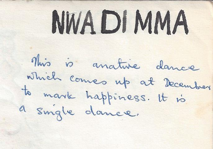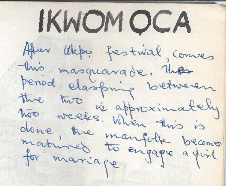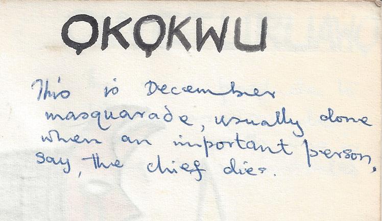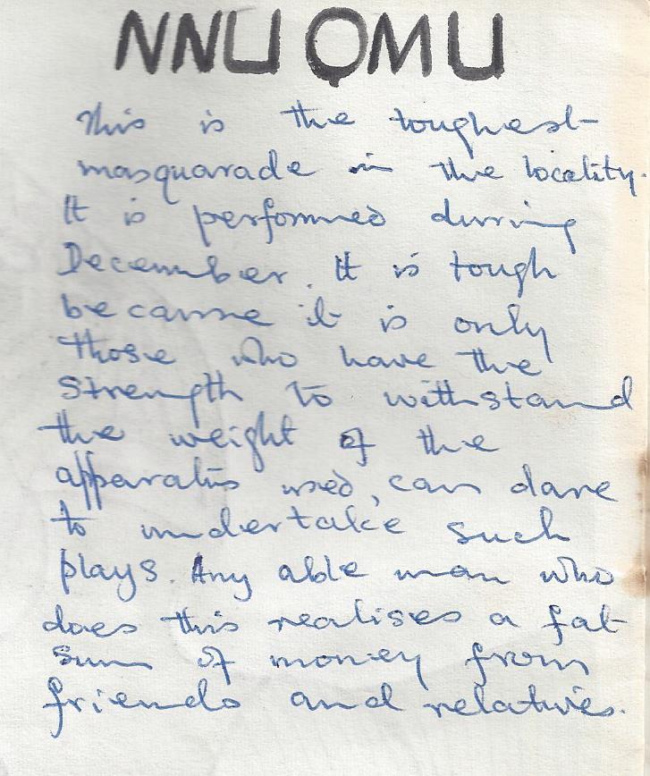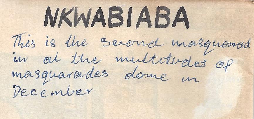 Being an outsider, I dare not attempt to take photographs of masquerades. As is true in all parts of Igboland, in 1966, masquerades were considered spirits and not acknowledged as villagers dressed up in costumes. Taking a picture of anyone was capturing their image, which they often viewed as capturing their soul. Many (not all) of the rural folk, were very afraid. When it came time to photograph the masquerades, the danger was that the viewer might later be able to recognize a familiar person by their stature and their movement. This would ruin the cover that was so protected by the secret men’s society that these were kinfolk in costumes, not real spirits. They were serious, and I was respectful.
