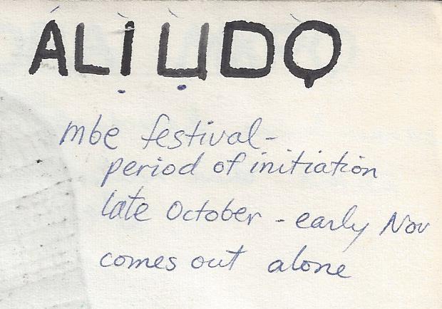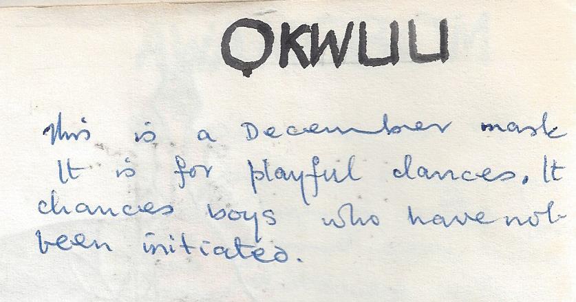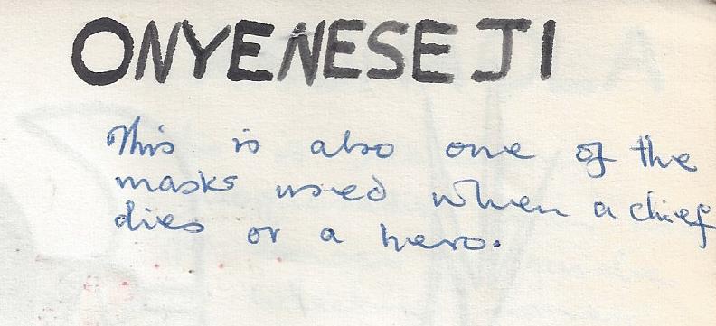I never really knew when masquerades would appear in the related Afikpo villages. It was just by chance that I might visit on a day when they were playing. When I collected masks from the carvers, I attempted to gather the names of the masks and the celebrations in which they appeared. These are shown on the data page for each mask in the Gallery.