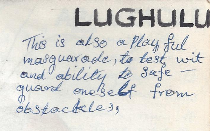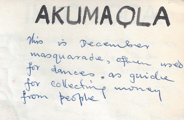 The identifying information is presented in the artist's handwriting. It is expressed in his charming language. I found his craftsmanship and attention to detail to be amazing. He carefully reproduced the prints found on market cloth, precisely traced arching parallel lines on raffia skirts, and nicely captured the details of the masks. To me, his workmanship is exceptional.