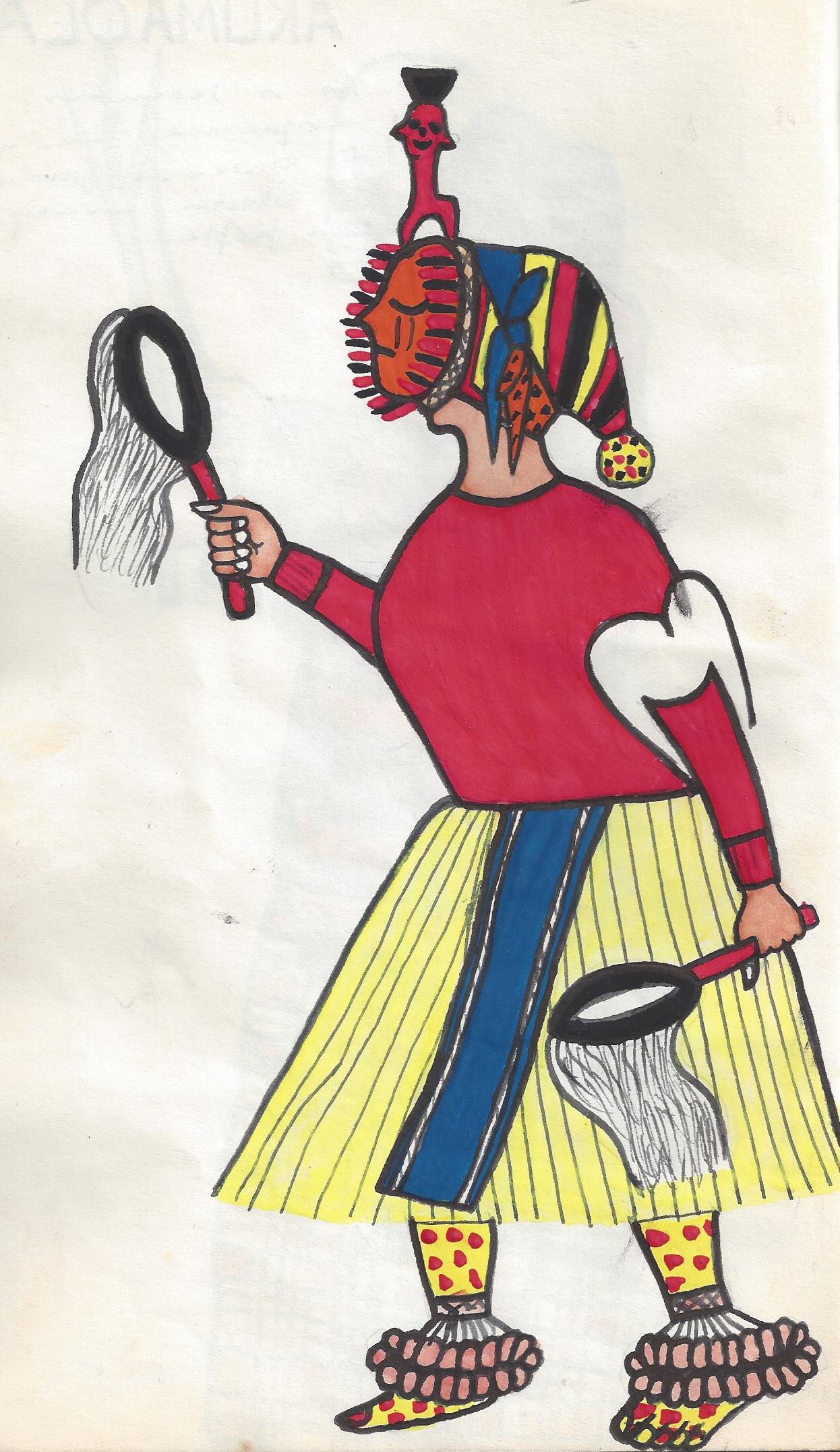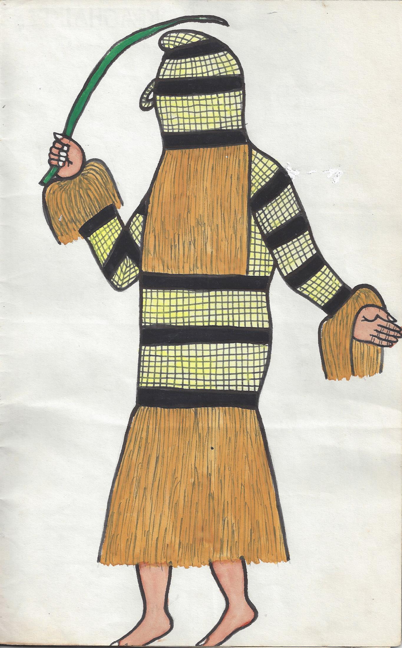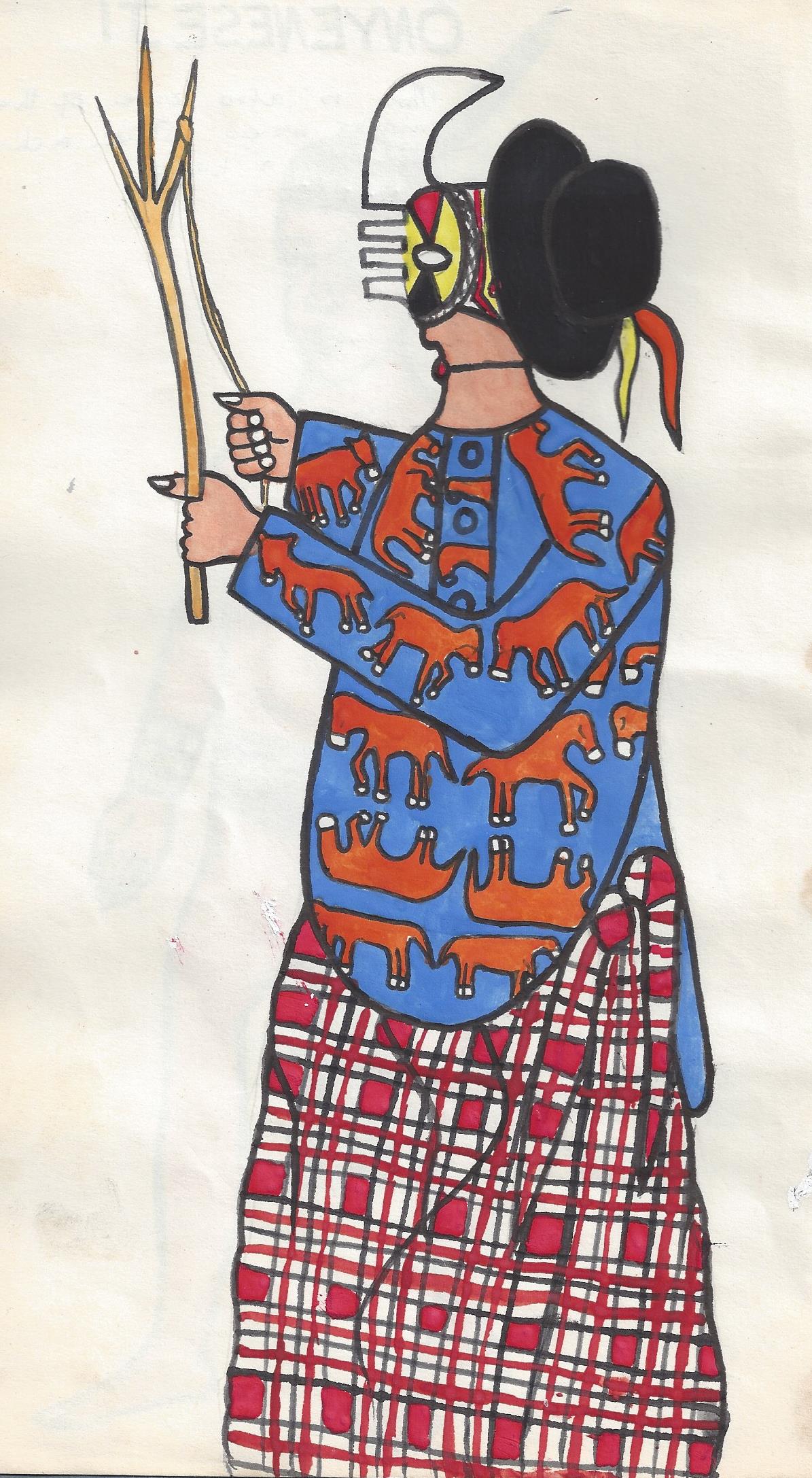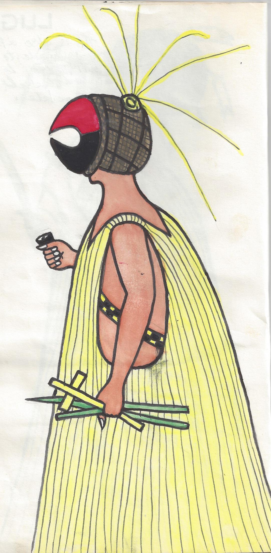 The identifying information is presented in the artist's handwriting. It is expressed in his charming language. I found his craftsmanship and attention to detail to be amazing. He carefully reproduced the prints found on market cloth, precisely traced arching parallel lines on raffia skirts, and nicely captured the details of the masks. To me, his workmanship is exceptional.