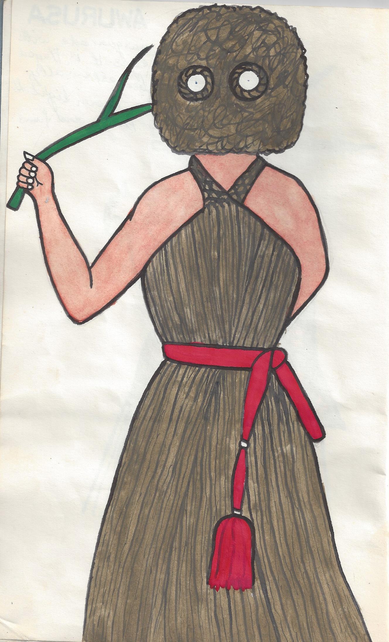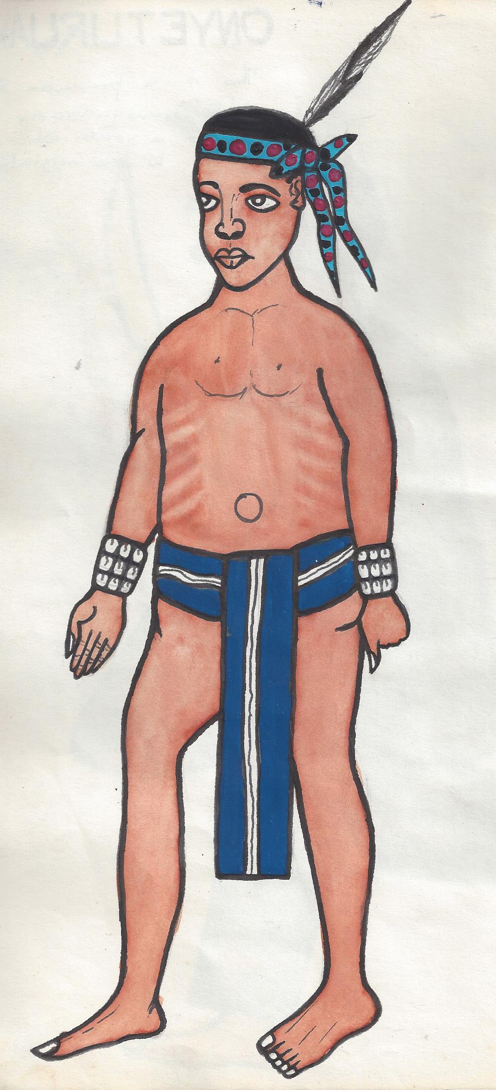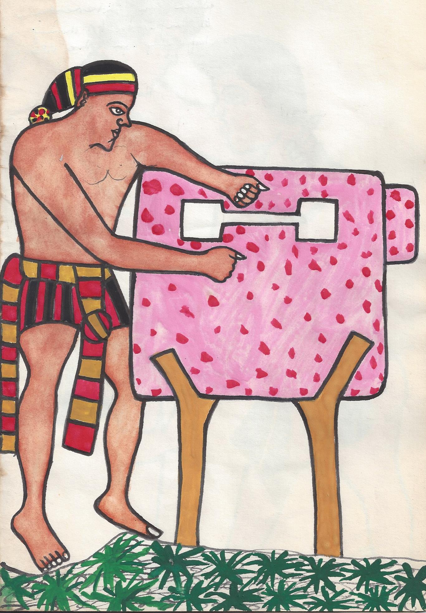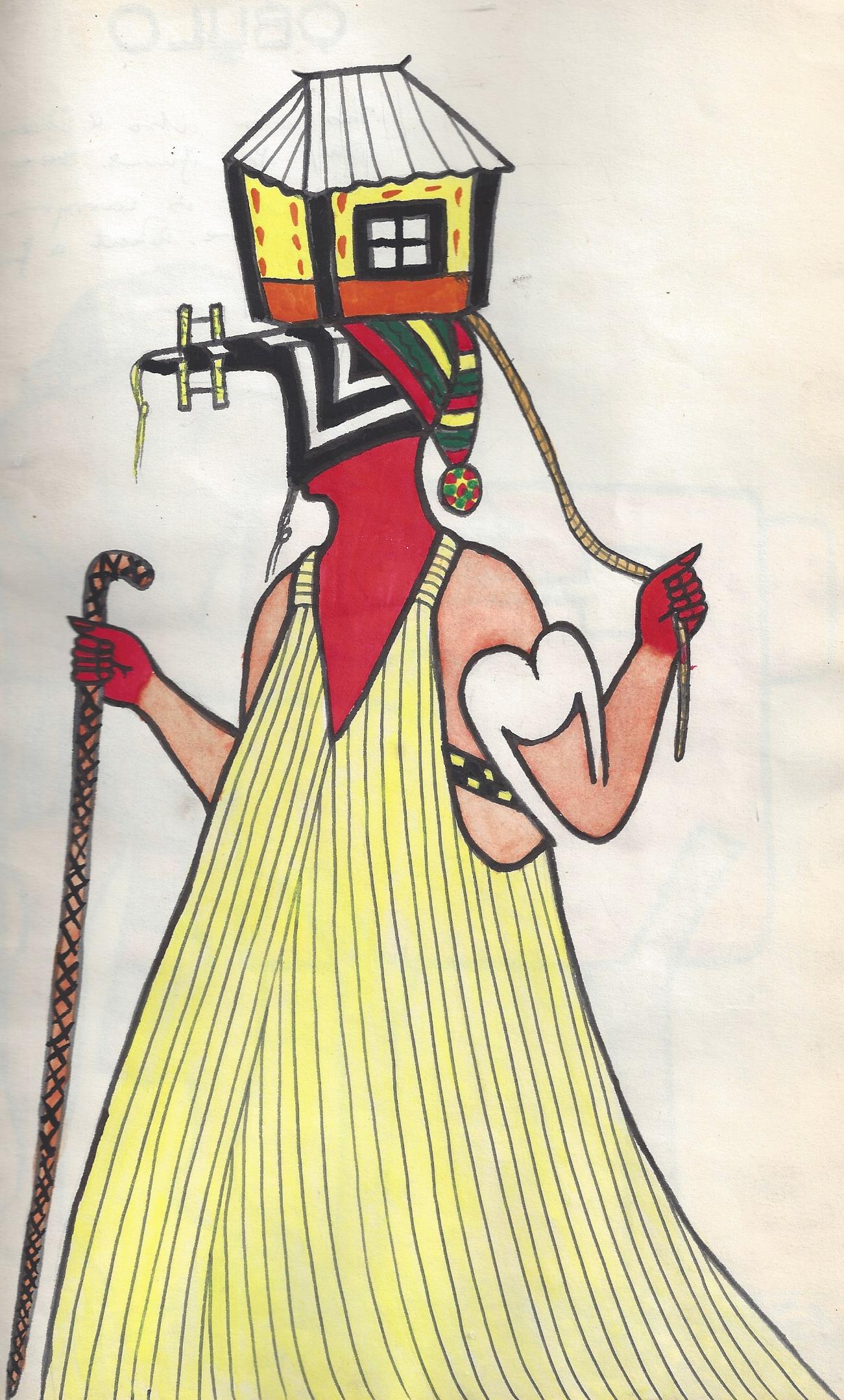 The identifying information is presented in the artist's handwriting. It is expressed in his charming language. I found his craftsmanship and attention to detail to be amazing. He carefully reproduced the prints found on market cloth, precisely traced arching parallel lines on raffia skirts, and nicely captured the details of the masks. To me, his workmanship is exceptional.