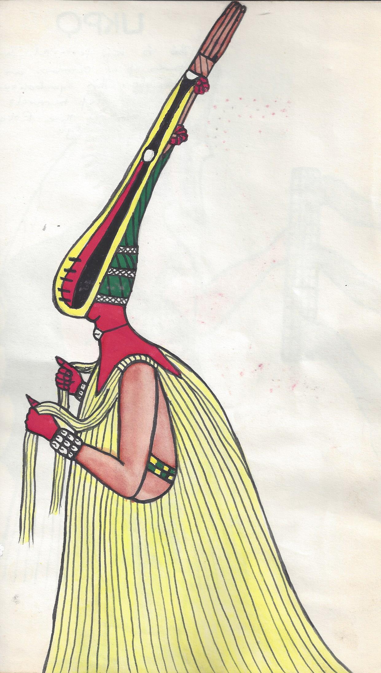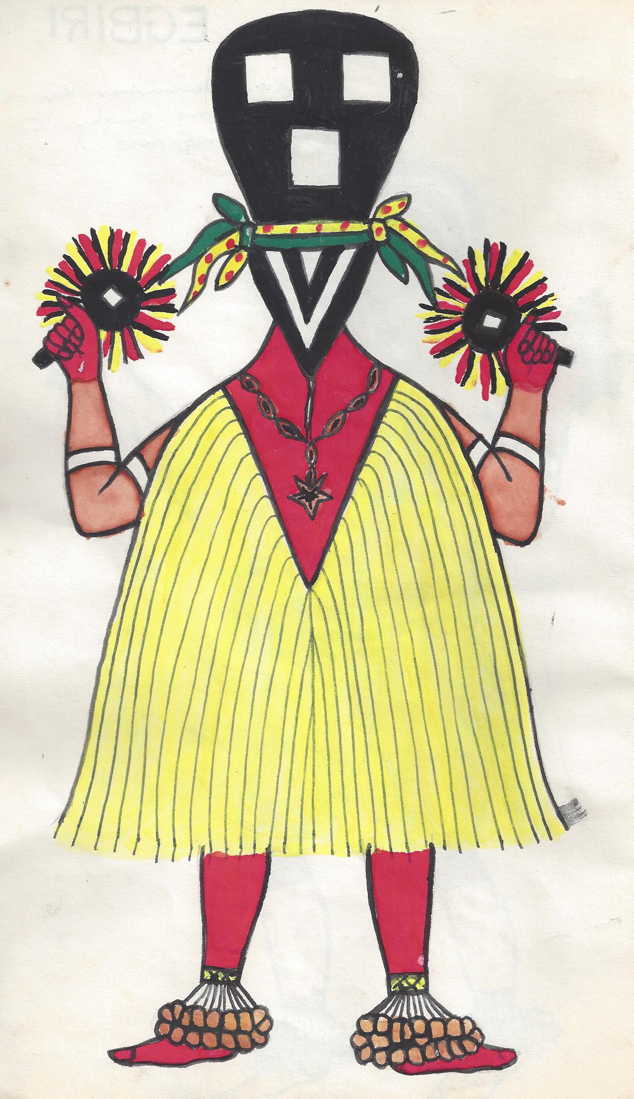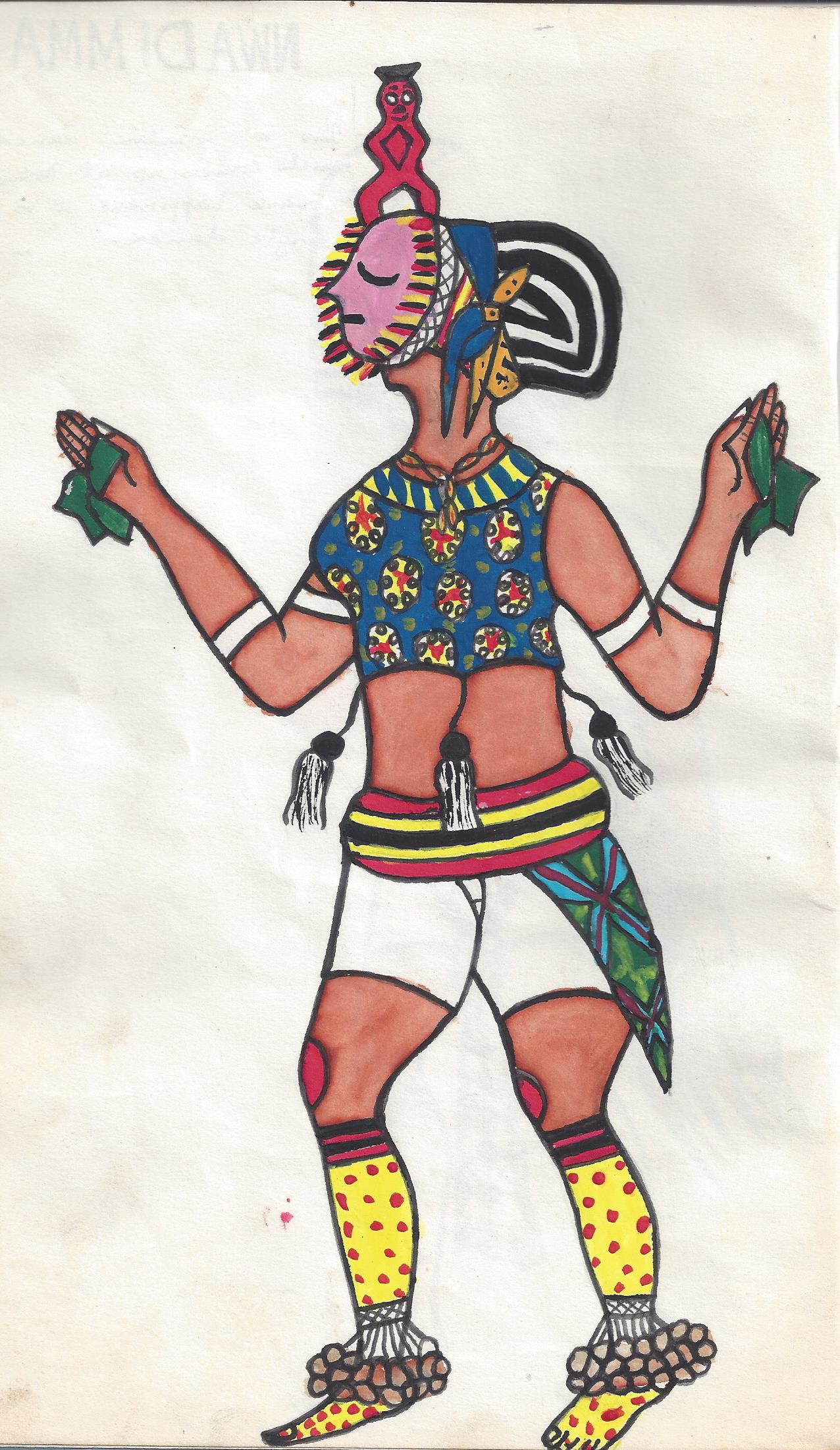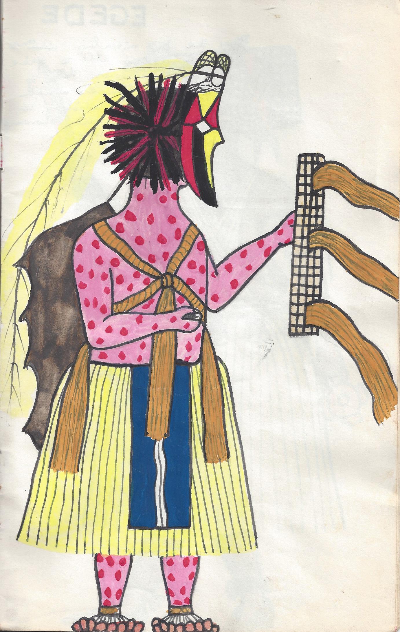 If I wasn’t around to see masquerades and couldn’t take pictures of them anyway, an idea and opportunity suddenly presented itself. Why not hire this teenager to produce watercolor paintings of so many of these masquerades? Fidelis acknowledged that he had detailed knowledge of the masquerades in his home village of Edda, just outside Afikpo town. I had collected a few Edda masks earlier and they can be found in the Gallery. Here was an opportunity to see what the accompanying costumes looked like, and to document the appropriate celebration or festival as well.