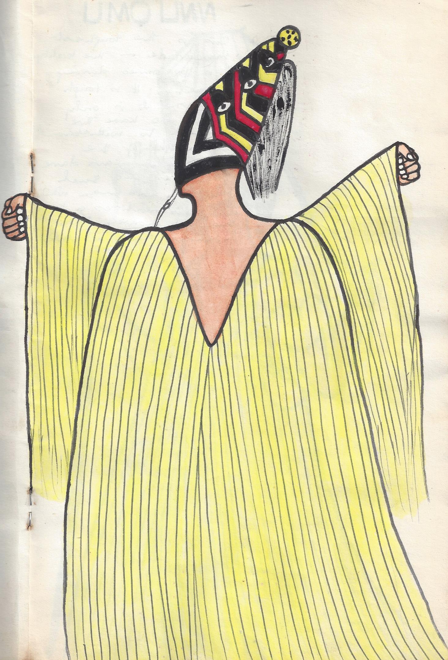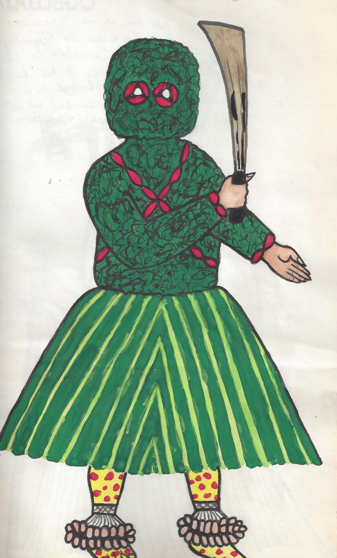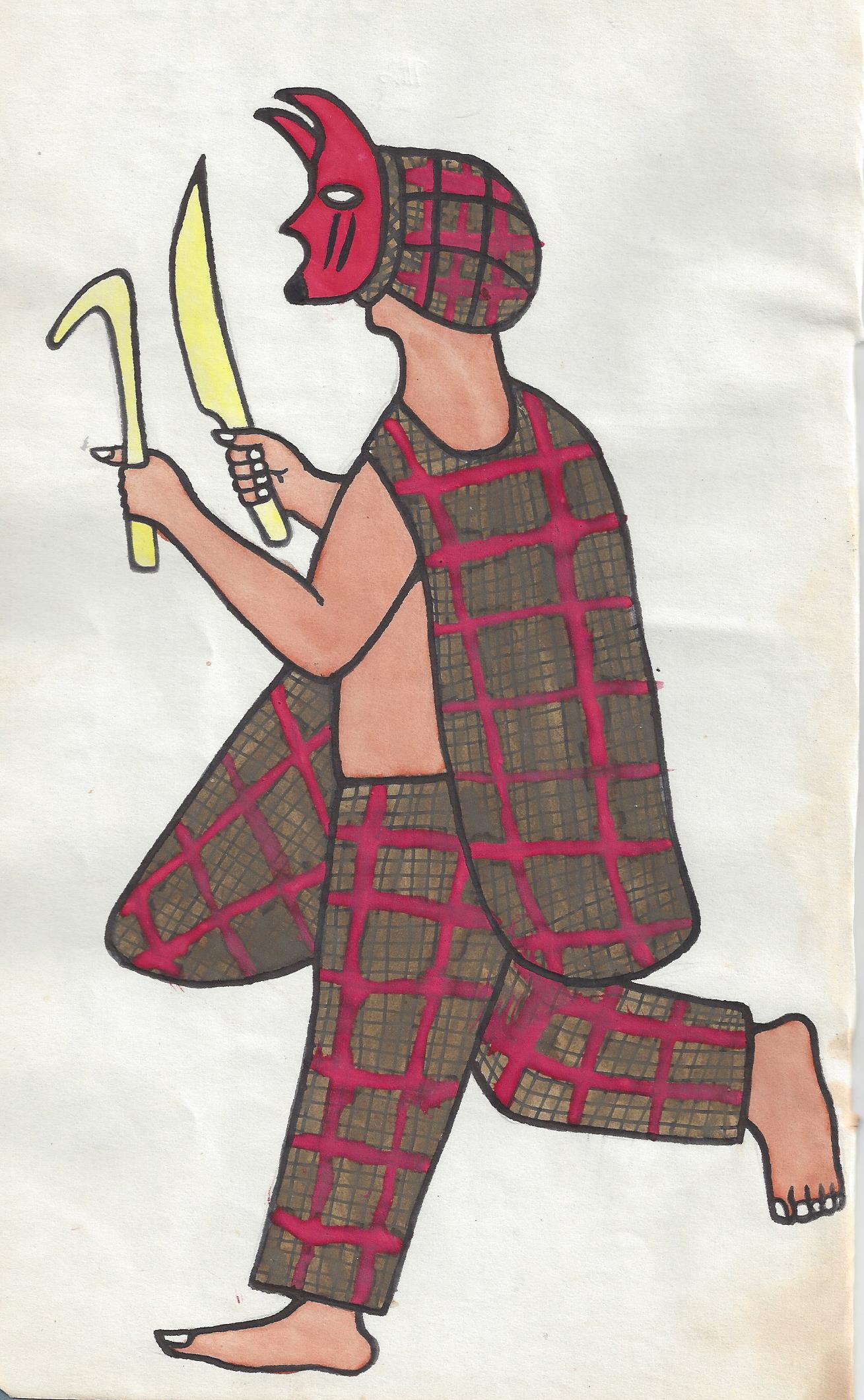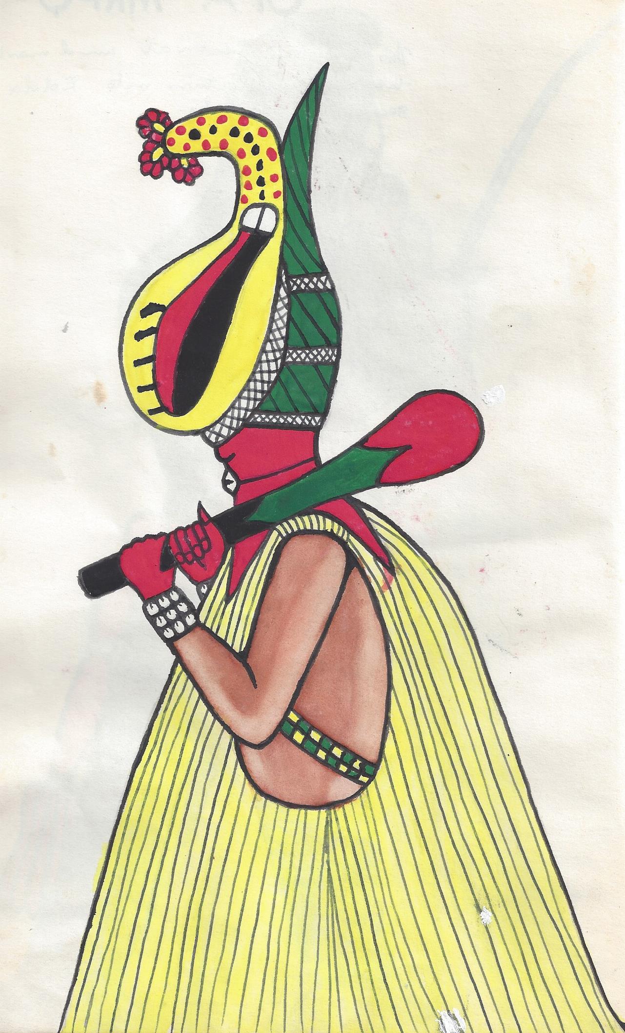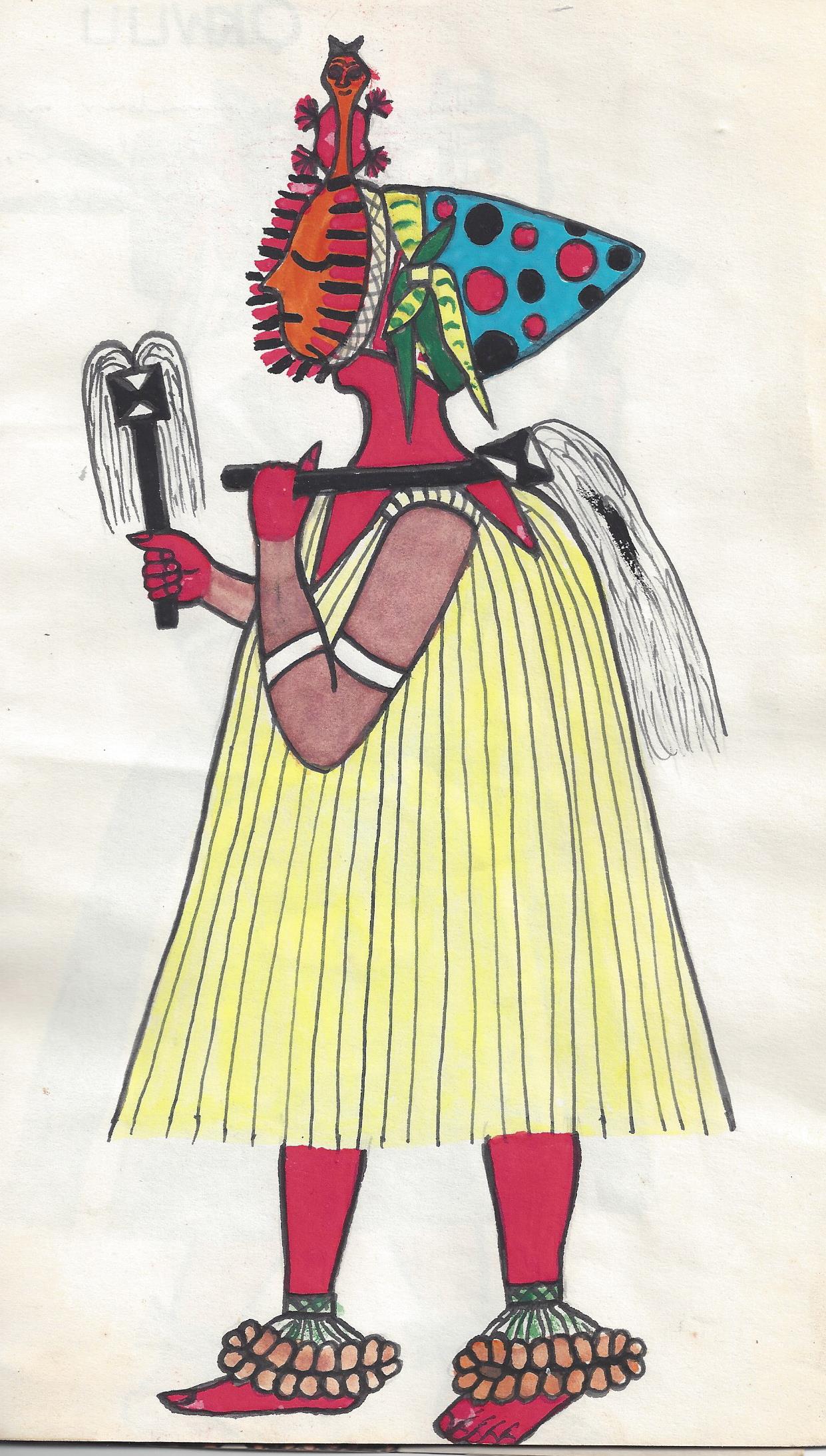If I wasn’t around to see masquerades and couldn’t take pictures of them anyway, an idea and opportunity suddenly presented itself. Why not hire this teenager to produce watercolor paintings of so many of these masquerades? Fidelis acknowledged that he had detailed knowledge of the masquerades in his home village of Edda, just outside Afikpo town. I had collected a few Edda masks earlier and they can be found in the Gallery. Here was an opportunity to see what the accompanying costumes looked like, and to document the appropriate celebration or festival as well.