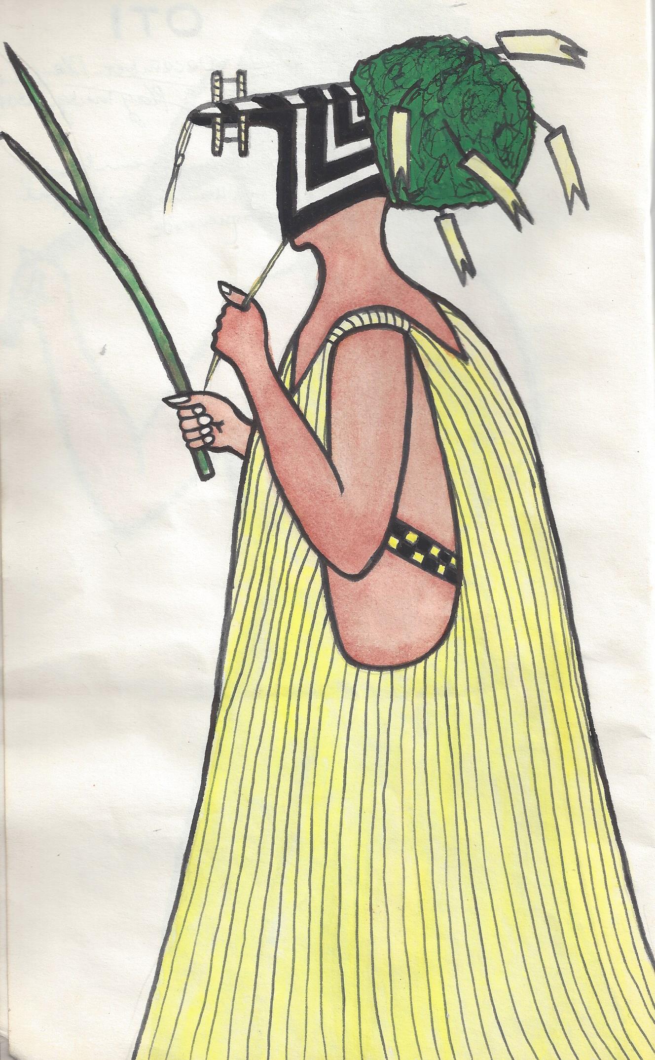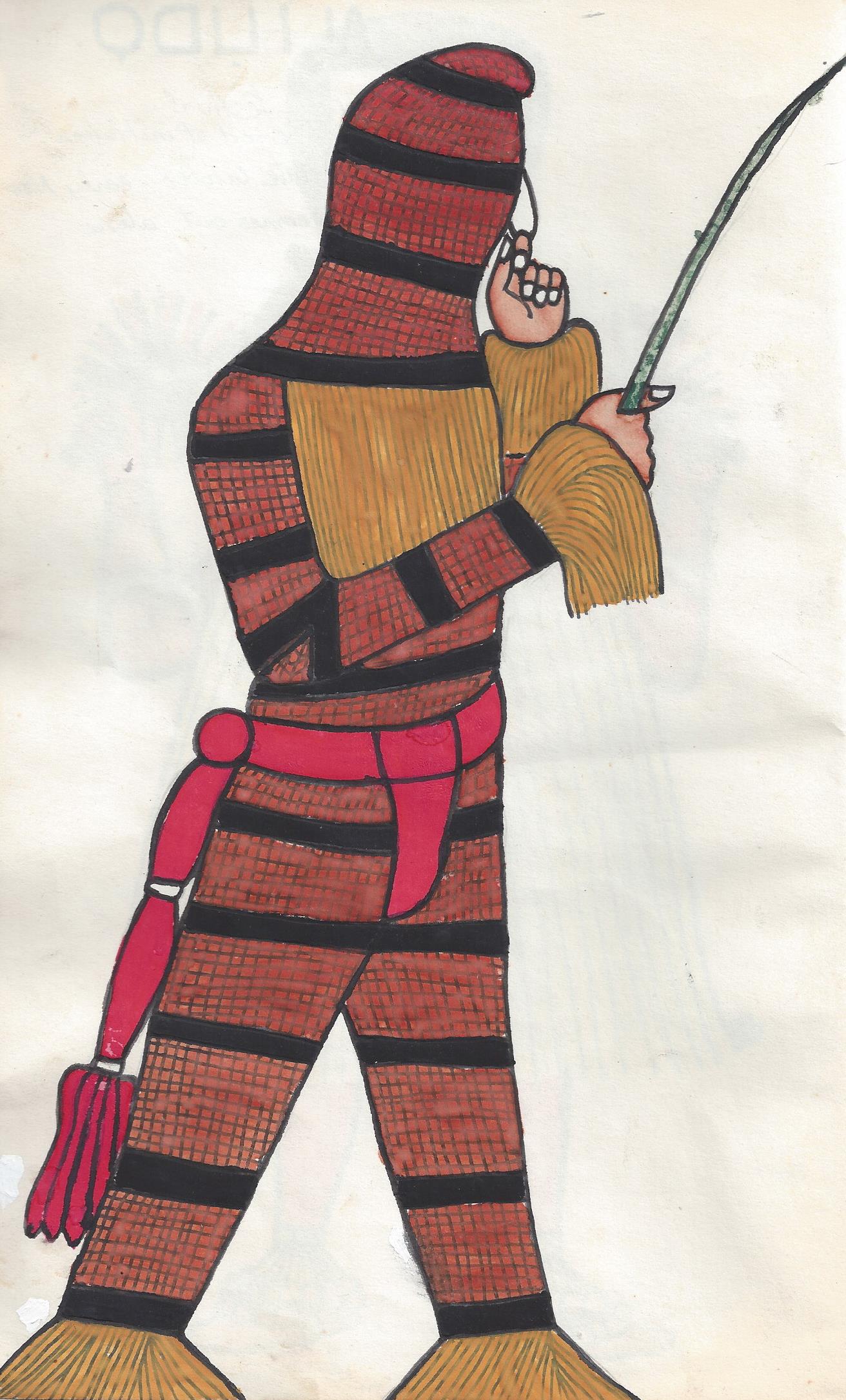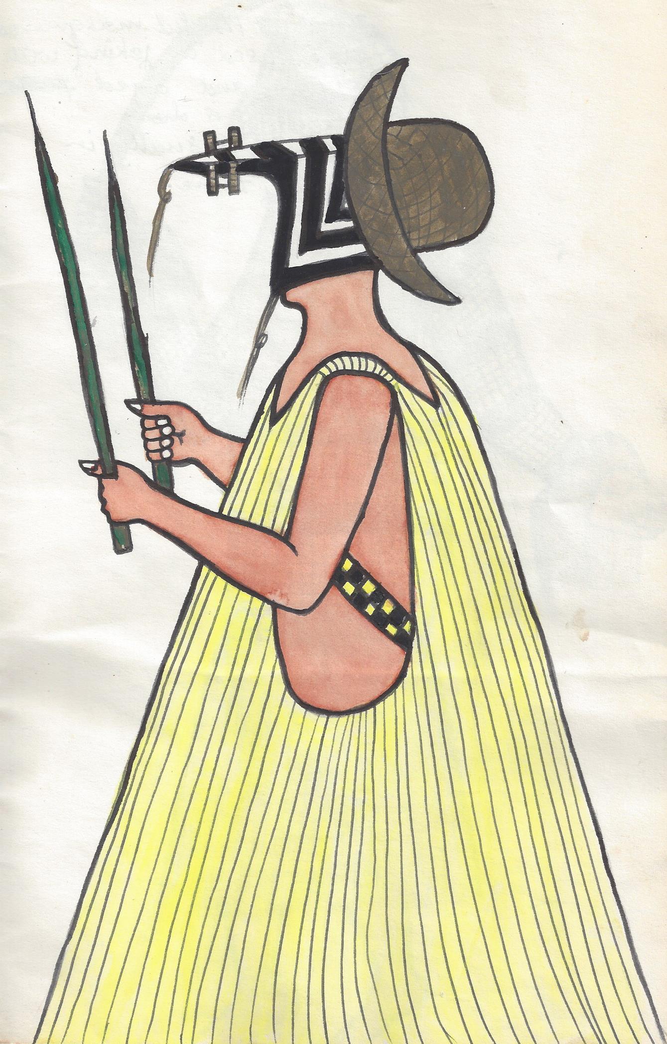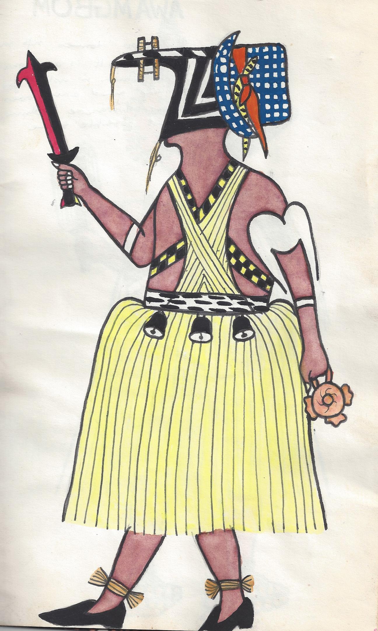 If I wasn’t around to see masquerades and couldn’t take pictures of them anyway, an idea and opportunity suddenly presented itself. Why not hire this teenager to produce watercolor paintings of so many of these masquerades? Fidelis acknowledged that he had detailed knowledge of the masquerades in his home village of Edda, just outside Afikpo town. I had collected a few Edda masks earlier and they can be found in the Gallery. Here was an opportunity to see what the accompanying costumes looked like, and to document the appropriate celebration or festival as well.