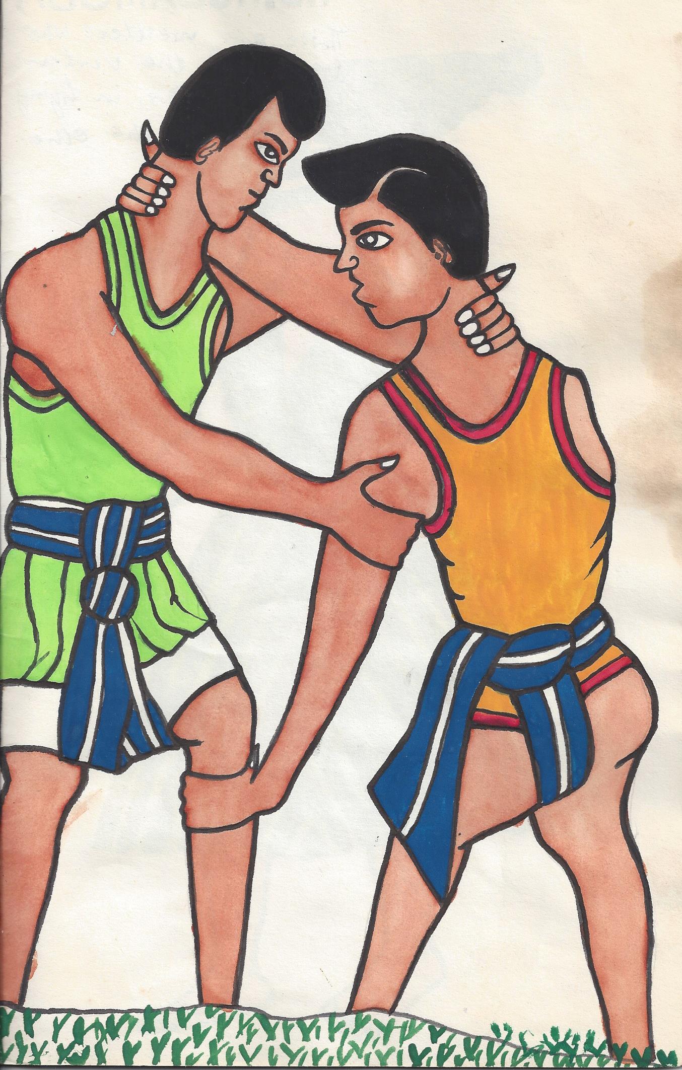 I never asked Fidelis about this, assuming, perhaps erroneously, that he was working exclusively in watercolors. It would be a mystery to me how gouache paints found their way to Afikpo in 1966, but maybe they were available through the school supply vendors where he purchased the copybooks. It is a mystery.